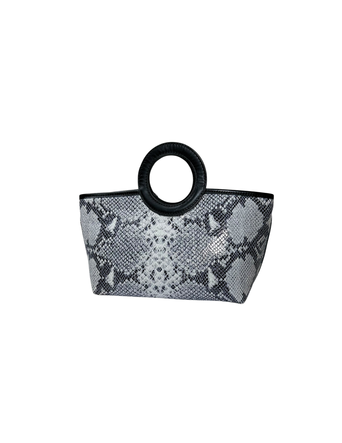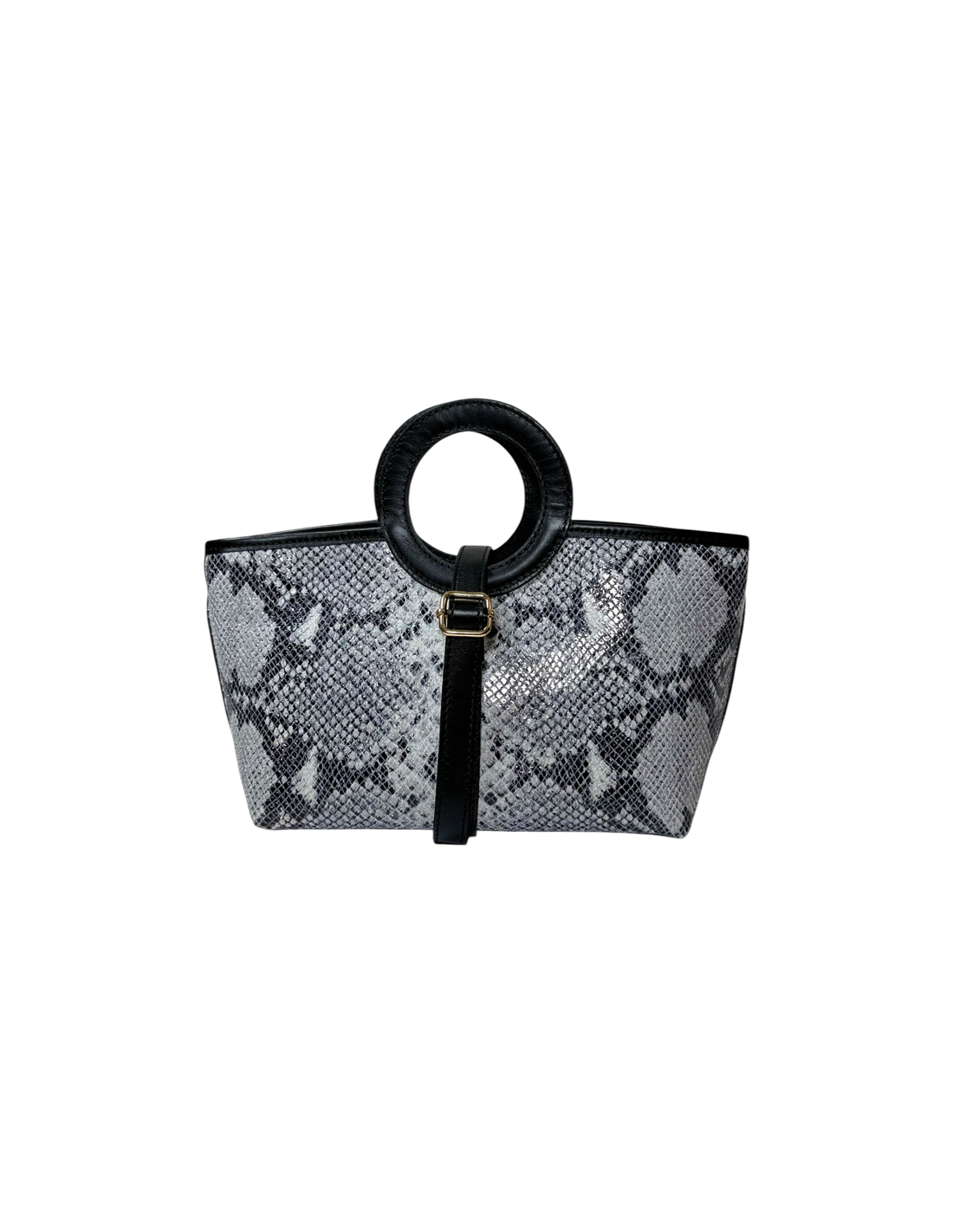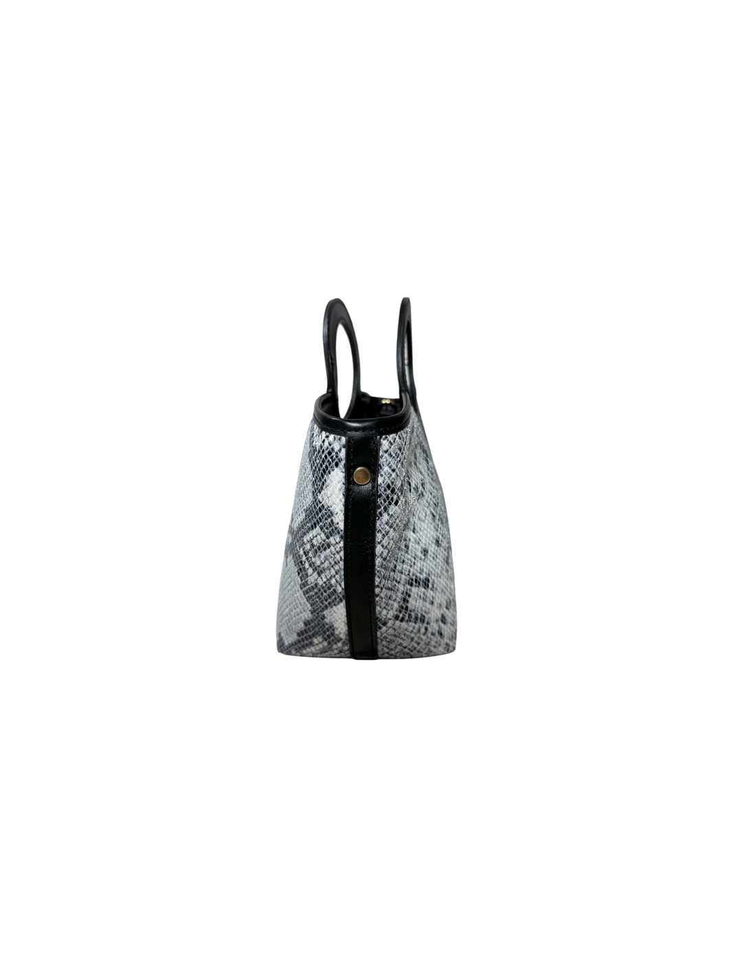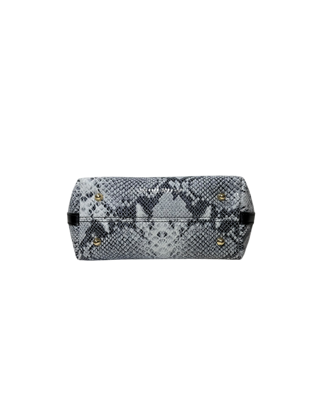 Borsa dal design moderno e di tendenza, realizzata con stampa effetto pitone che richiama uno dei trend più attuali della moda. La silhouette trapezoidale,  dona un aspetto contemporaneo e distintivo, perfetto per valorizzare sia look casual che più ricercati.