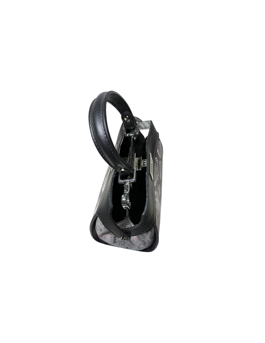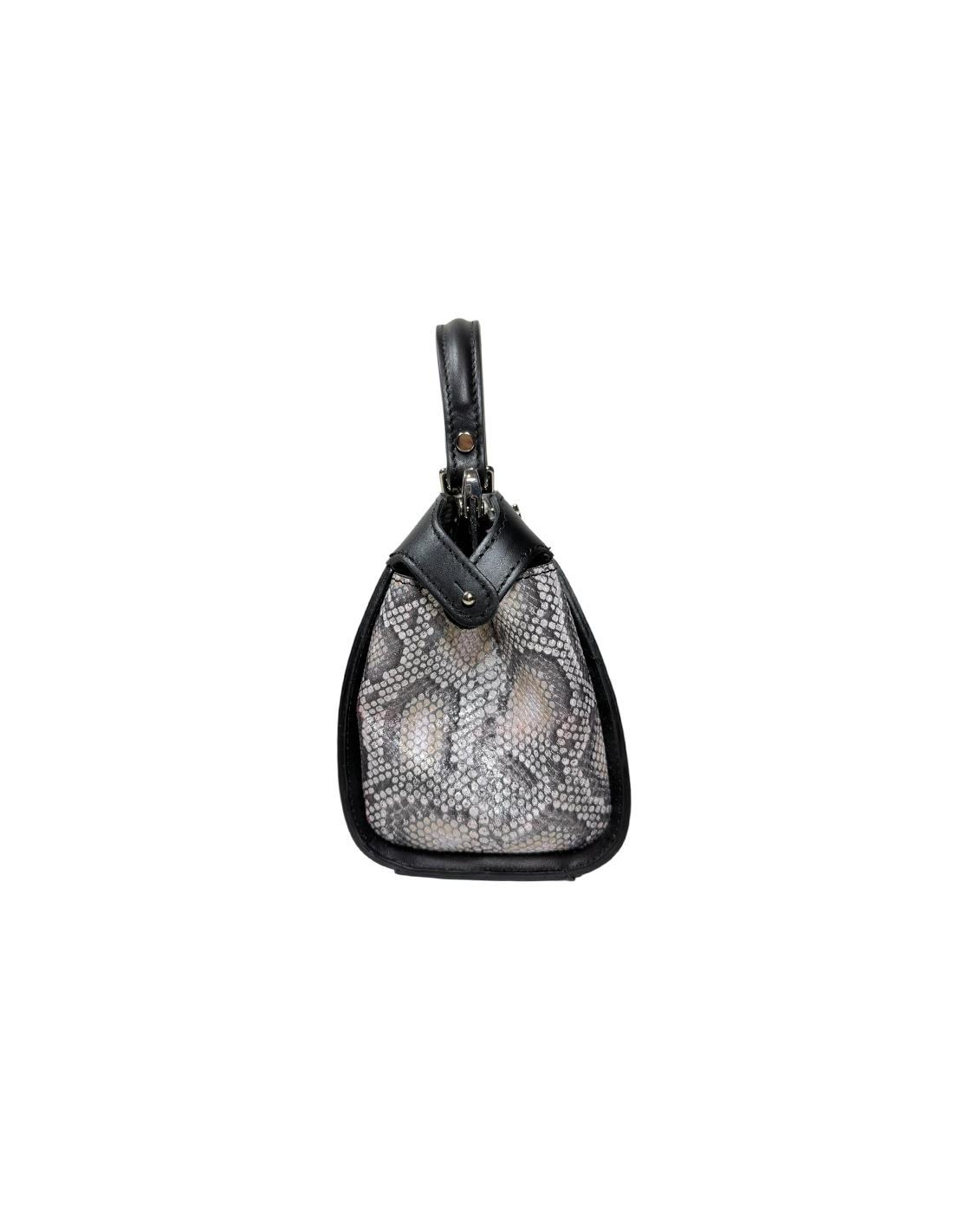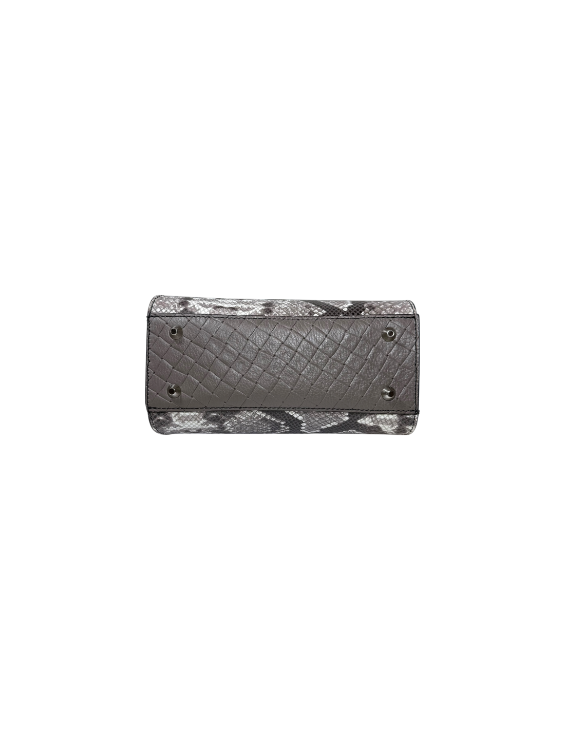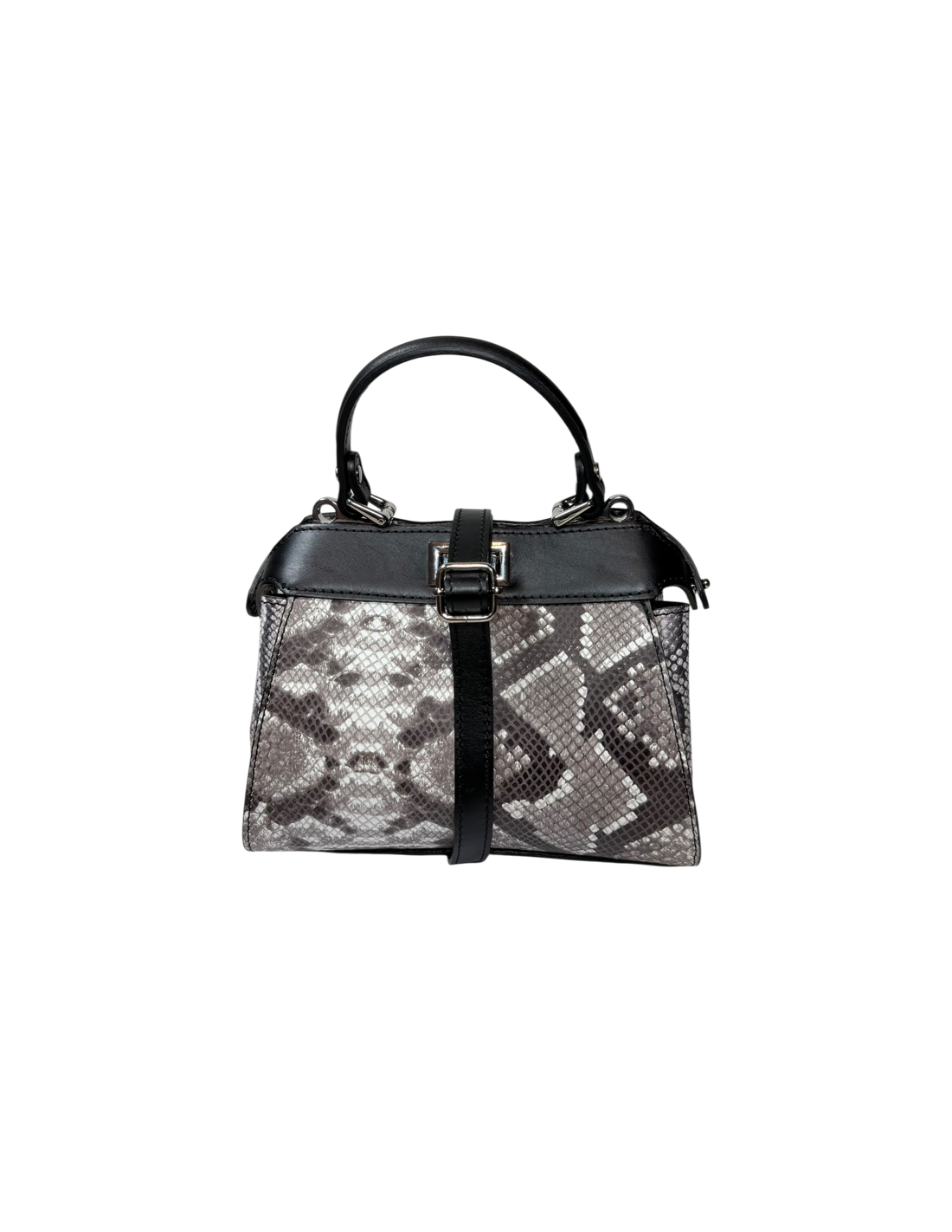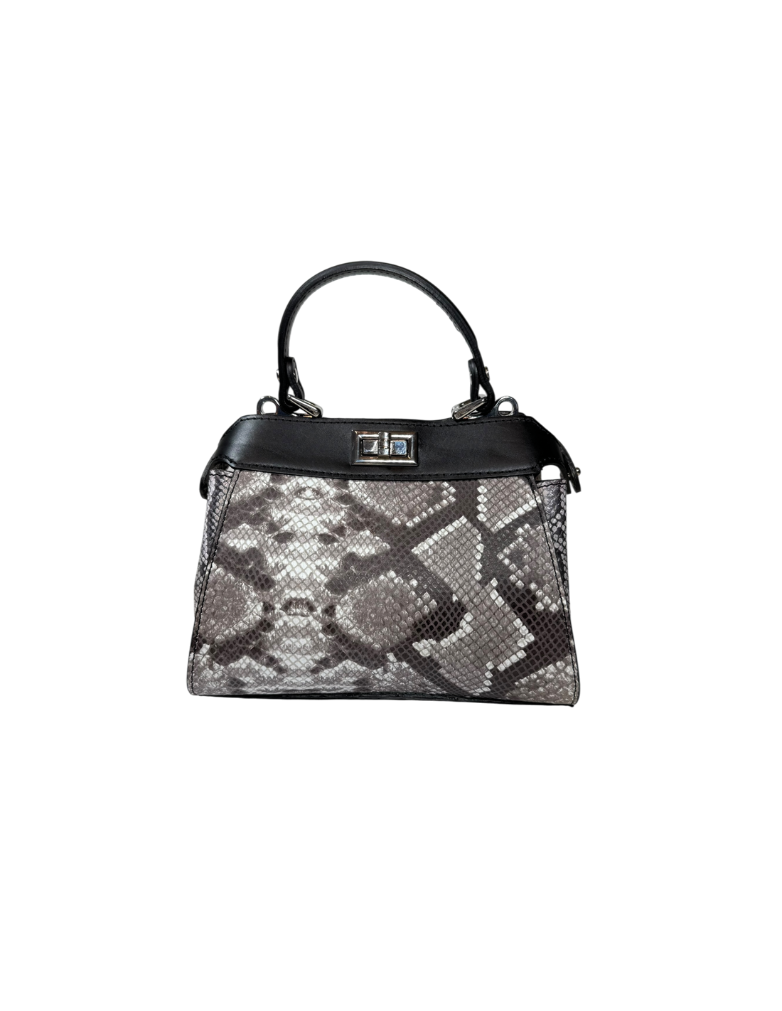 Borsa strutturata dal design elegante e contemporaneo, caratterizzata da una silhouette compatta e sofisticata ispirata allo stile iconico delle borse a doppia apertura laterale. La lavorazione con stampa effetto pitone, nelle tonalità del marrone, dona un aspetto ricercato e di grande tendenza, mentre la base color tortora crea un raffinato contrasto cromatico.