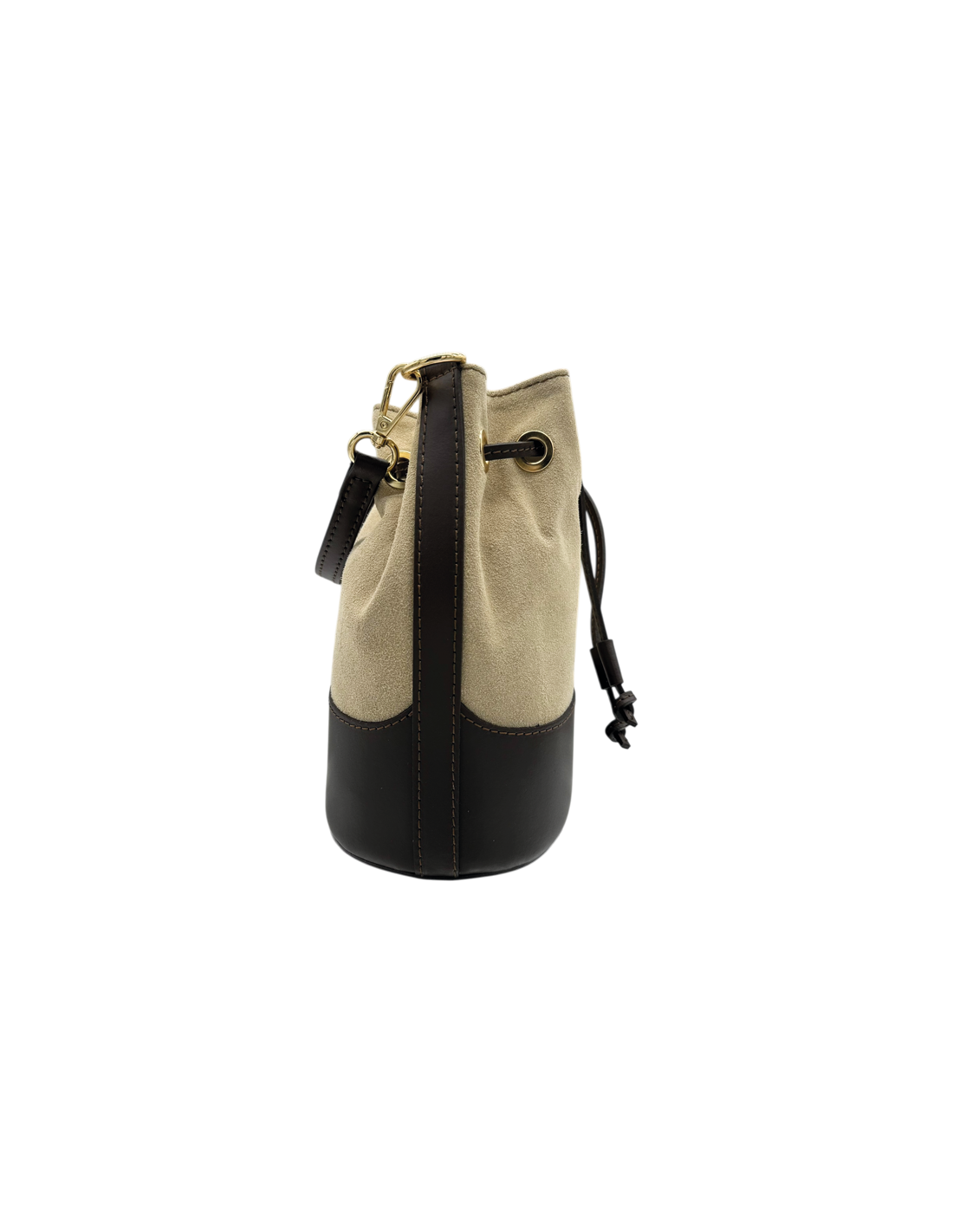 Secchiello piccolo realizzato in pelle (fondo e bordi) e camoscio (corpo).
