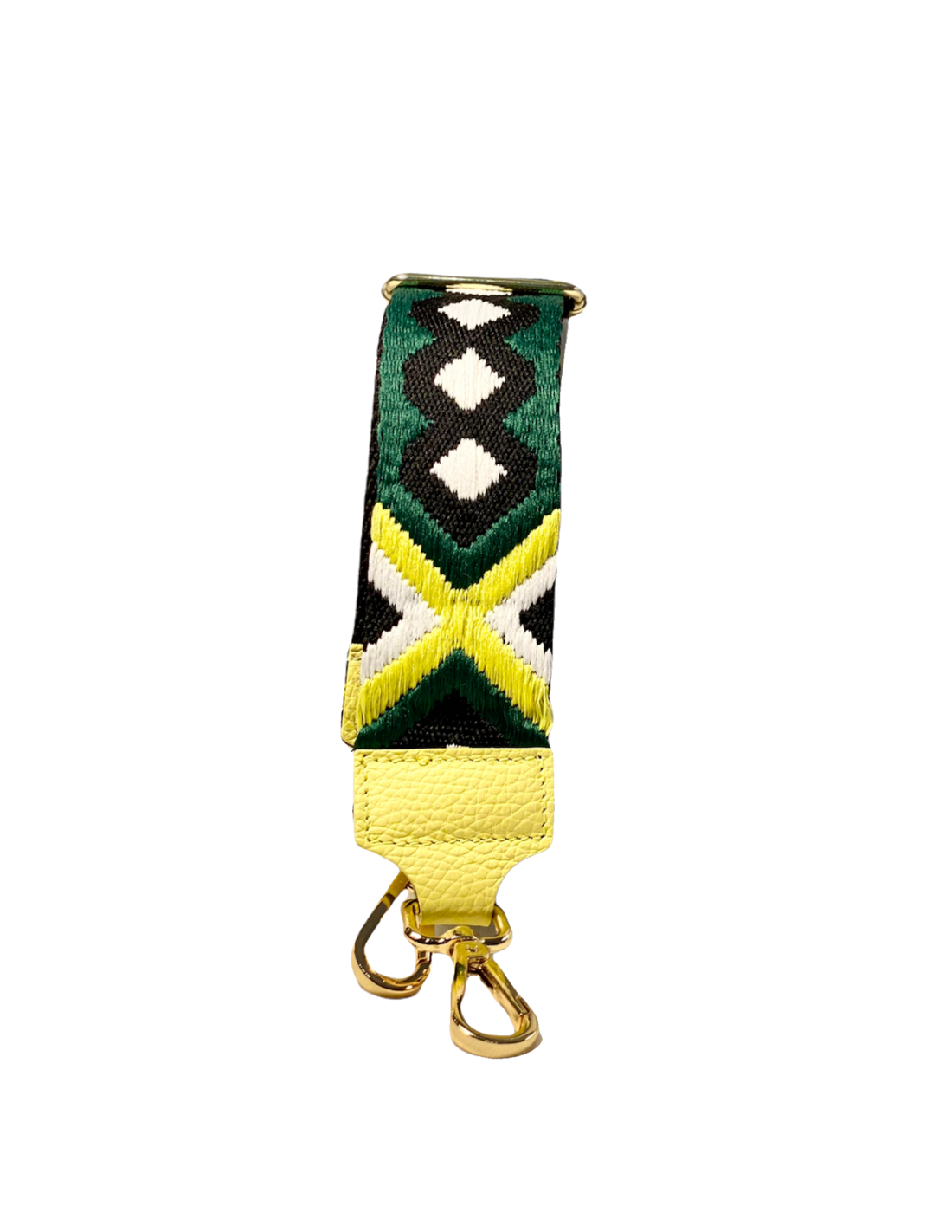 Tracolla personalizzabile in pelle giallo chiaro , fantasia tessuto colori rombi giallo, verde, nero e bianco