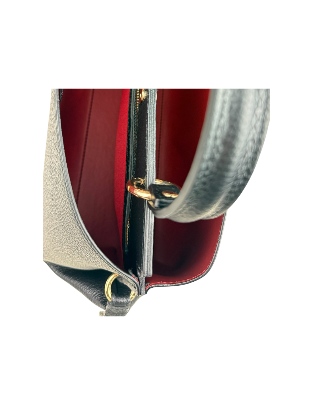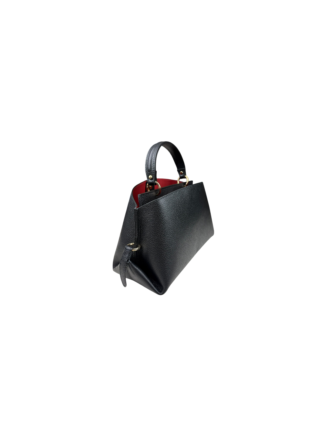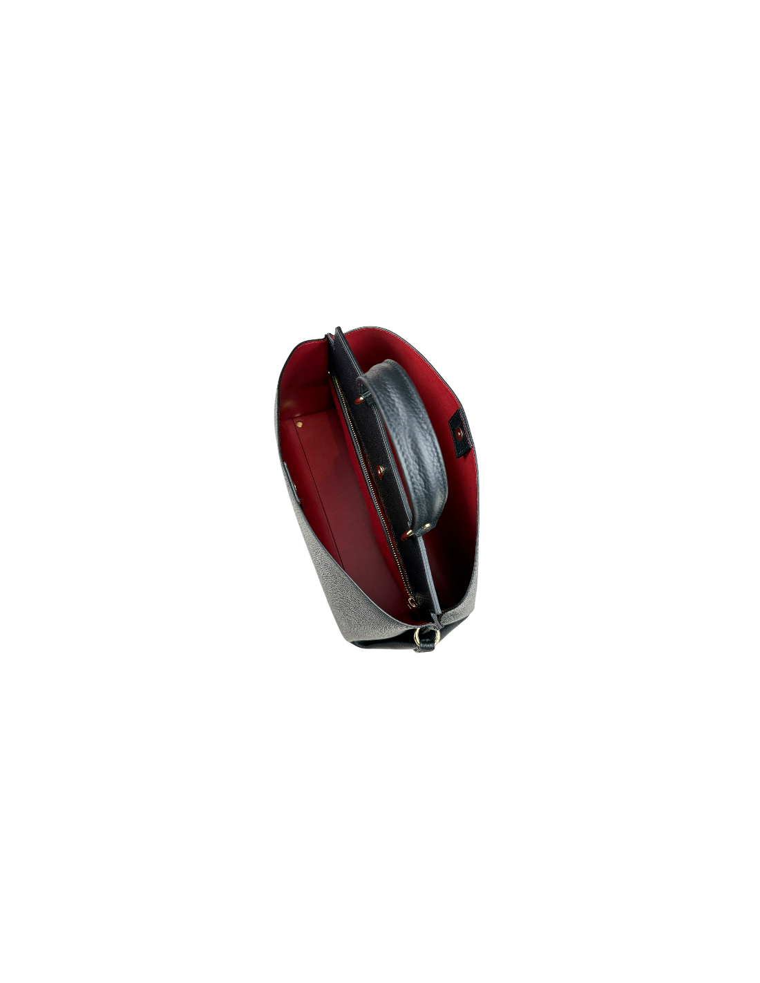 Non dimenticare di salvare la tua personalizzazione per poter riempire il carrelloElegante e funzionale, questa borsa in pelle nera unisce stile e praticità. Dotata di manico e tracolla regolabile in pelle, può essere comodamente portata a spalla o a mano. L’interno rosso, con divisorio centrale a doppia zip, crea due scomparti separati per mantenere organizzati e al sicuro tutti gli oggetti.